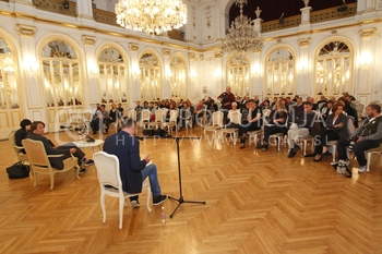 Božidar Novak, ustanovitelj SPEM Komunikacijske skupine, Aleš Šteger: predstavitev knjige Odpusti o Mariboru in hobotnici, Kazinska dvorana, SNG Maribor