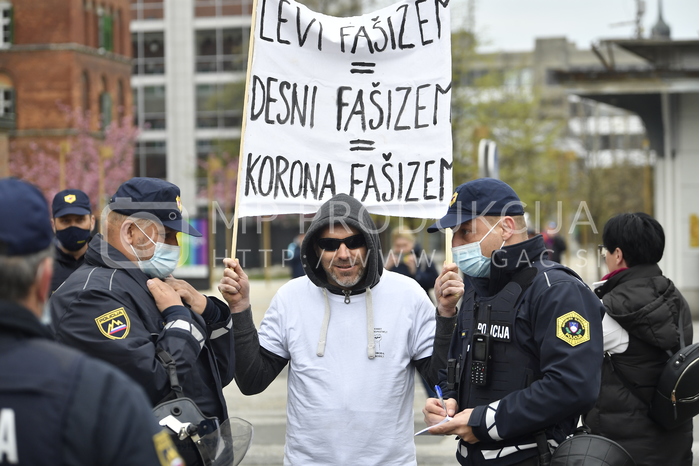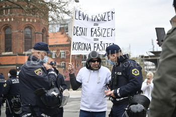Protestnik Transparent Levi fašizem, desni fašizem, korona fašizem, Policija PU Maribor izvaja postopek identifikacije protestnikov, Protest proti ukrepom vlade Republike Slovenije - Trg svobode Maribor