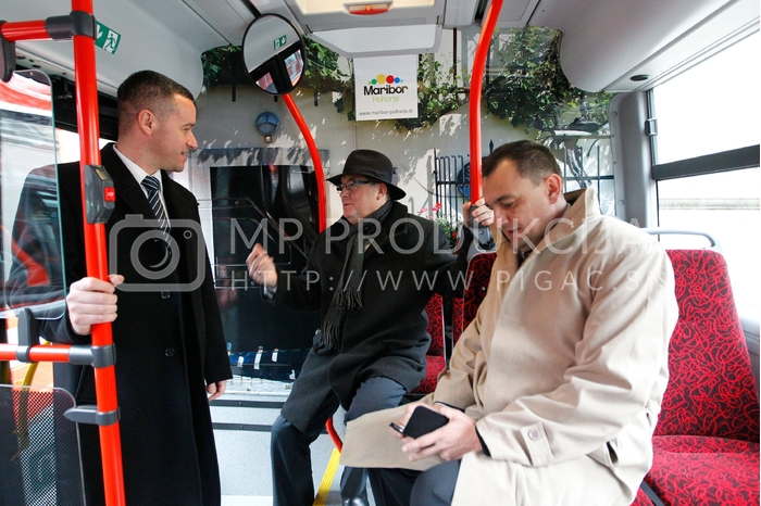 - Peter Baštič, direktor vzhodne jadranske regije za avtobuse Scania, dr. Andrej Fištravec, župan Mestne občine Maribor, Bernard Majhenič, direktor Marproma, 5 novih avtobusov Marproma - avtobus Marprom, Trg svobode, Maribor Avtor: MP Produkcija
