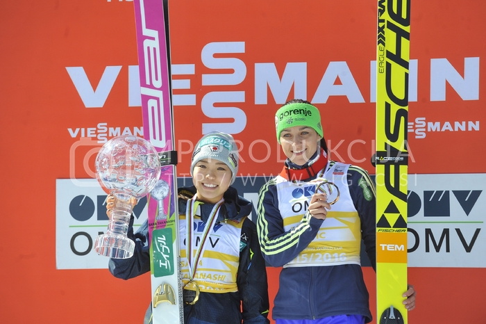 - Sara Takanashi, smučarska skakalka, trikratna dobitnica velikega kristalnega globusa v smučarskih skokih za sezone 2013, 2014 in 2016, Maja Vtič, slovenska smučarska skakalka, tretja v skupni razvrstitvi v sezoni 2015-16, Veliki finale v smučarskih skokih sezone 2015-2016, Letalnica bratov Gorišek, Planica, Dolina pod Poncami Avtor: MP Produkcija