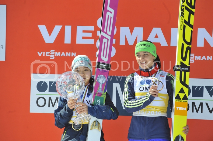- Sara Takanashi, smučarska skakalka, trikratna dobitnica velikega kristalnega globusa v smučarskih skokih za sezone 2013, 2014 in 2016, Maja Vtič, slovenska smučarska skakalka, tretja v skupni razvrstitvi v sezoni 2015-16, Veliki finale v smučarskih skokih sezone 2015-2016, Letalnica bratov Gorišek, Planica, Dolina pod Poncami Avtor: MP Produkcija