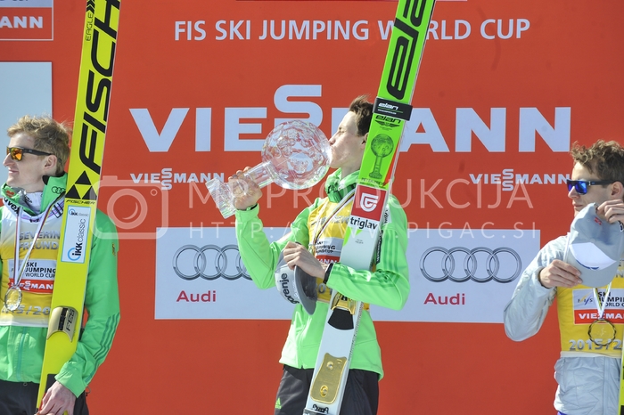 - Severin Freund, dobitnik velikega kristalnega globusa v smučarskih skokih za sezono 2014-2015, Peter Prevc, dobitnik velikega kristalnega globusa v skokih za sezono 2015, Kenneth Gangnes, smučarski skakalec, Veliki finale v smučarskih skokih sezone 2015-2016, Letalnica bratov Gorišek, Planica, Dolina pod Poncami Avtor: MP Produkcija