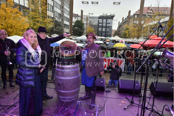 - Kaja Šerbinek, mariborska vinska kraljica 2016-2018, dr. Andrej Fištravec, župan Mestne občine Maribor, Alojz Jenuš - Slavek, outar in brač iz Malečnika, 33. tradicionalno martinovanje - Trg Leona Štuklja Maribor Avtor: MP Produkcija