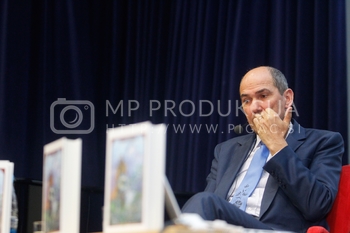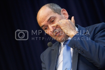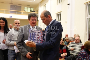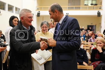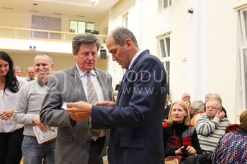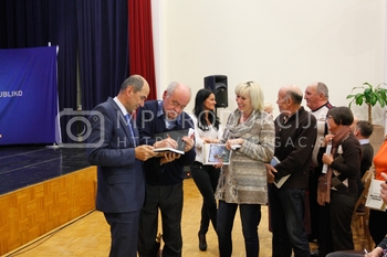 Gregor Pivec, predsednik MO SDS Maribor in direktor UKC Maribor, Janez Janša, predsednik SDS, predstavitev knjige Noriško kraljestvo, Beli panter, 1. del, V dvorani Zavoda Antona Martina Slomška na Vrbanski v Mariboru