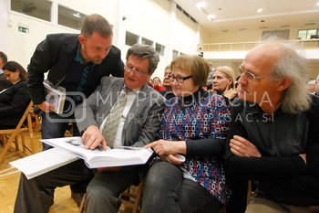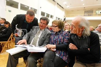 Janez Janša, predsednik SDS, Ivan Štuhec, strokovni direktor Zavoda Antona Martina Slomška, predstavitev knjige Noriško kraljestvo, Beli panter, 1. del, V dvorani Zavoda Antona Martina Slomška na Vrbanski v Mariboru