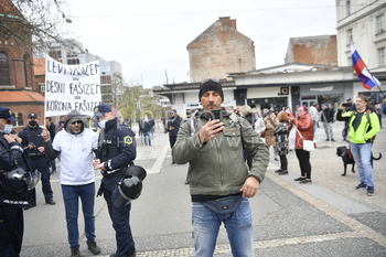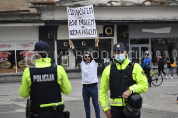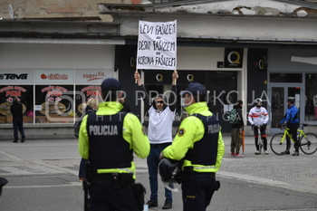 Protestnik Transparent Levi fašizem, desni fašizem, korona fašizem, Policija PU Maribor izvaja postopek identifikacije protestnikov, Protest proti ukrepom vlade Republike Slovenije - Trg svobode Maribor